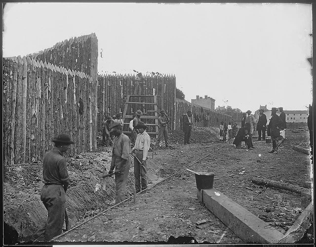 The Army hired thousands of civilians to build trenches and stockades, work the wharves, and otherwise perform manual labor. In this photo, the black men--perhaps free blacks but more likely men who had escaped slavery and come into Union-occupied Alexandria for freedom--do the work, while the white men on the right look over the operation.