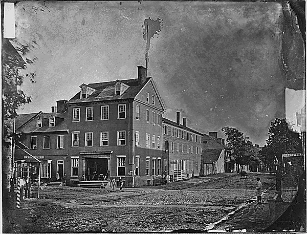 Last in his series of photos but first in terms of war significance, the Marshall House Hotel, the site of the current Hotel Monaco. The hotelkeeper, James Jackson, had hoisted a large Confederate flag on the pole in 1861, which supposedly the Lincolns could see from the White House. When the army came into Alexandria in May 1861, Col. Elmer Ellsworth cut down the flag. Jackson killed him; one of Ellsworth's men killed Jackson.