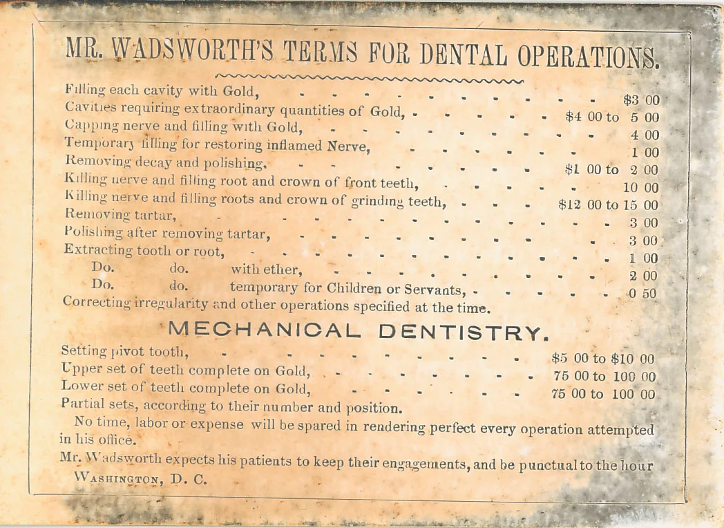 The cost at dentist H.N. Wadsworth's office on C Street, image from his Findagrave entry.