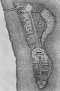 This map shows a causeway to the Virginia side, the location of the mansion, gardens, and roads.